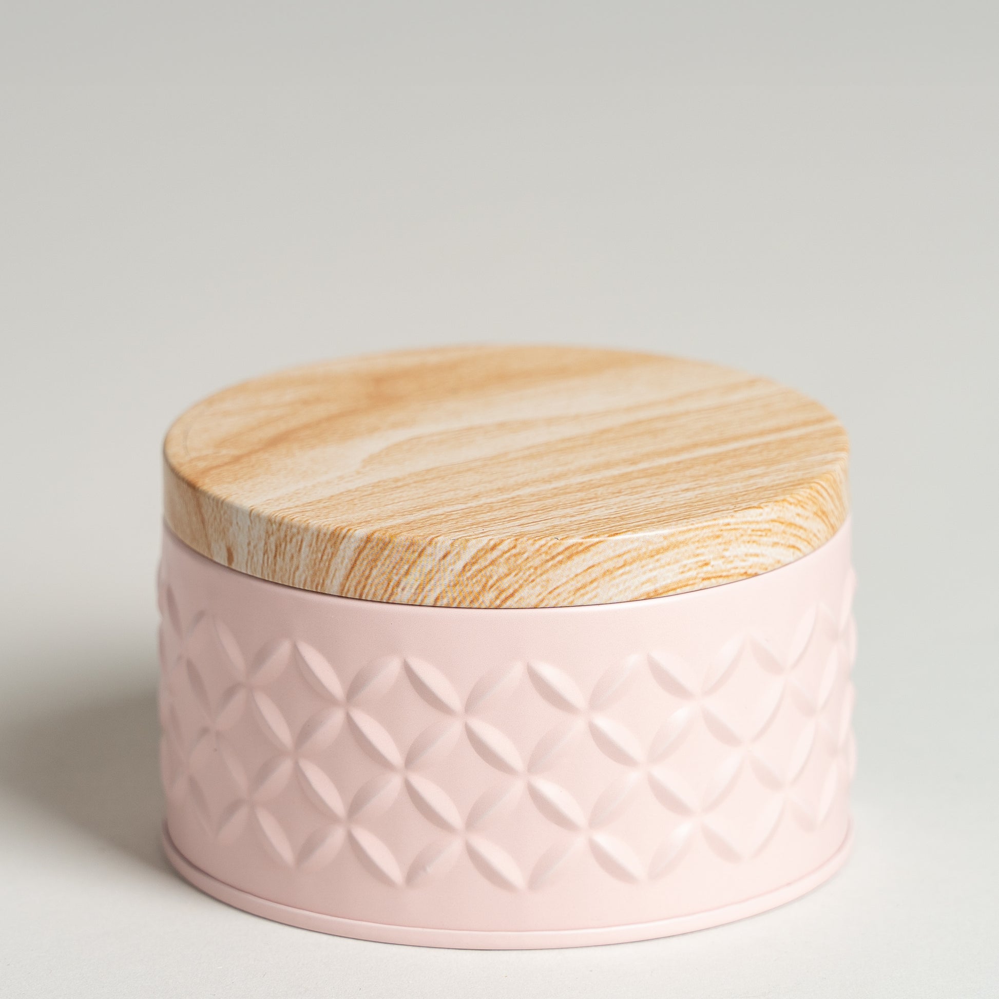 Lata tapa tipo madera base rosa 10x6 cm